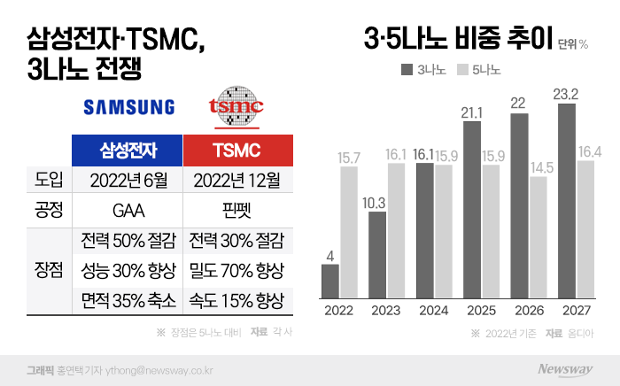 그나마 희소식은 TSMC에서 3나노를 핀펫으로 생산하는데, 2나노로 가면서 결국 GAA 기술을 도입할 수 밖에 없을 것이란 것. 따라서 삼성이 3나노부터 GAA 기술을 도입했으니 기술적으로는 조금이나마 우위라는 것!