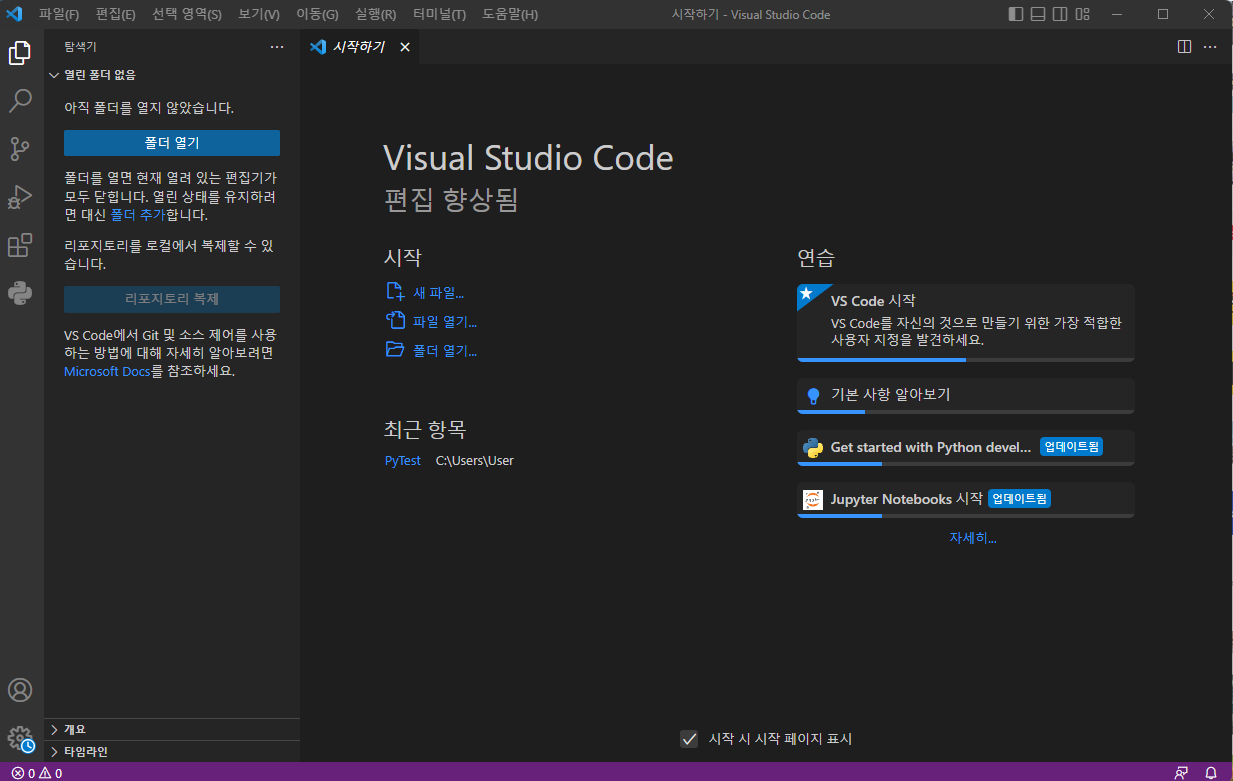 - 예전에 파이썬 했을 때에 비주얼 스튜디오 코드를 썼다. 그거 한국어로 세팅해 놓은 게 있기도 하고, 책에서도 IDLE 에디터는 긴 코딩에 적합하지 않다고 하니, 비주얼 스튜디오 코드로 파이썬을 다룰 예정!