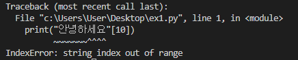 이유: "안녕하세요"의 문자열은 [0]부터 [4]까지 있다. print("안녕하세요"[5])의 경우 문자열에 없는 문자를 선택하고 있으므로 IndexError가 뜰 것이다.